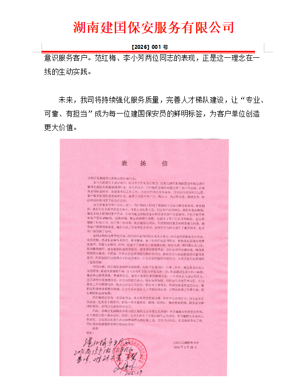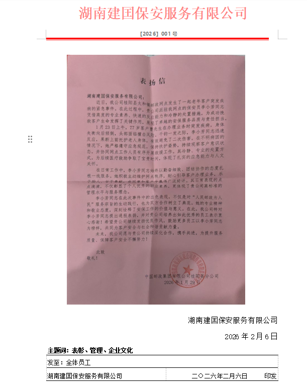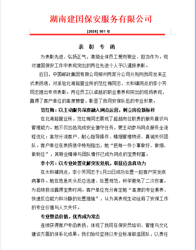 近日,中国邮政集团有限公司郴州两家分公司分别向我司发来正式表扬信,对派驻北湖路营业所的范红梅同志、太和镇网点的李小芳同志提出专项表彰。两位员工以卓越的职业素养和突出的现场表现,赢得了客户单位的高度赞誉,彰显了我司安保队伍的专业形象。