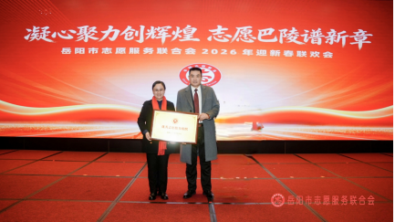 在岳阳市志愿服务联合会2026年迎新春联欢会上,市志愿服务联合会副会长、建囯爱心义工协会会长蔡建国,秘书长张娟玲代表协会参加。现场洋溢着温暖与欢乐氛围,大家共同回顾过去一年的志愿服务成果,展望新一年的美好愿景。