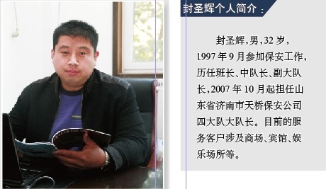 我叫封圣辉,1997年9月参加保安工作,历任班长、中队长、副大队长,2007年10月起担任山东省济南市天桥保安公司四大队大队长。在从事保安工作的13年里,我从一个保安行业的门外汉到一个真正的保安员,从一名普通保安员逐步成长为一名大队长,期间点点滴滴的积累,让我懂得了很多,也成熟了不少。在队伍管理中,也积累了一些关于保安队伍管理的经验,我将它总结为保安管理的“三部曲”——选兵挑将、厉兵秣马、以质取胜,以期与全国的保安同行分享。