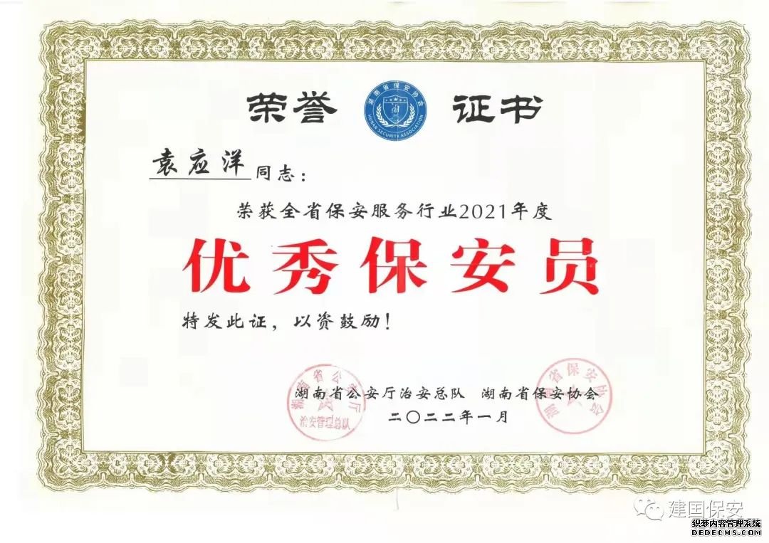 袁应洋,男,1970年出生,大专文化,中共党员,曾在湖南武警郴州消防大队服役三年,2016年加入湖南建囯保安服务有限公司,被派遣到岳阳市委党校任保安队长。6年来多次获得用人单位和保安公司嘉奖表扬。因工作表现出色,连续4年被公司评为年度优秀保安队长,2020年在抗击肺炎疫情的战斗中,被公司评为“最美逆行者",2021年12月,被湖南省保安协会评为优秀保安队长。他时刻以一名老兵的标准,严格要求自己,模范带头,表现出色,在队长岗位上被组织批准加入了中国共产党,被公司誉为“保安岗位的一面旗帜”。