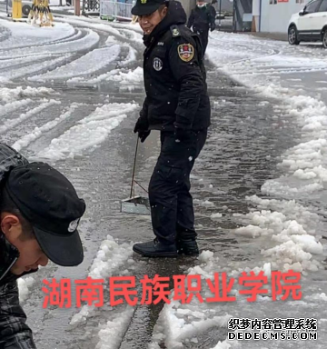 图为:湖南民族职业学院保安员冒雨清理积雪