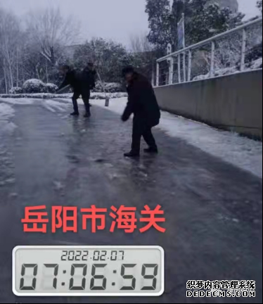 图为:岳阳市海关保安员清理路面积雪