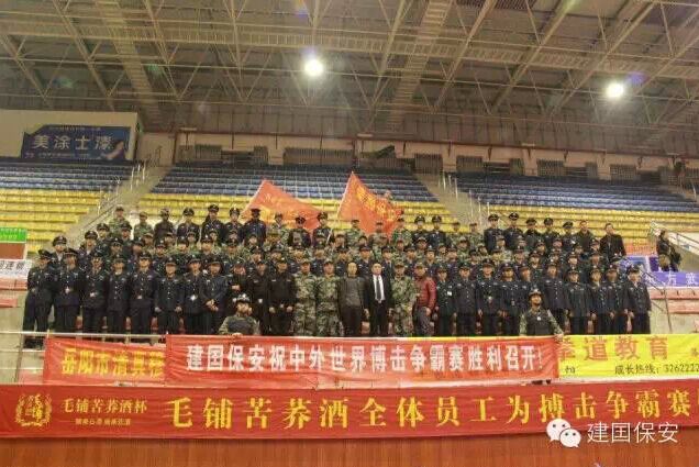 2015年1月24日晚上,“2015中国 岳阳第二届中外拳击争霸赛”在岳阳职院体育馆隆重举行。新加坡、菲律宾、越南、韩国、泰国、法国以及中国岳阳的选手参加了本次比赛。建囯保安公司独家担任此次赛事的全程安保,公司派出200名英武年轻强健的保安执行安保任务,另外有建囯保安黄埔志愿者等多个团队的90名志愿者参与了本次搏击盛会的现场维护。