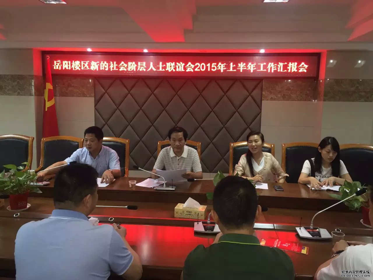 2015年7月24日,新的社会阶层人士联谊会各位会长、秘书长于在楼区统战部6楼召开2015年上半年度工作汇报重要会议,到会的有区委常委、组织部统战部部长彭端生、统战部副部长许越波、副部长刘晓红、主任胡湘玉等领导出席会议,伍玉龙会长代表协会作了详细的工作汇报,各位副会长秘书长也都一一发言,区领导高度重视新联会工作,对新联会给予了最高荣誉的肯定,并寄予了殷切希望,区委常委组织部部长统战部部长彭端生希望协会进一步创新思维适应新常态,敢闯敢试合理攻克难关,互帮互助凝聚活力!统战部副部长非公党委书记许越波高度肯定协会充满激情与活力,有很强的聚集力在非公经济组织里是最强的,工作的执行力非常高,无论是要求还是布置都执行得很好!希望协会加强完善会员管理制度,制定进退机制,做到严进宽去!进一步政治参与、事业协作、奉献社会!最后伍玉龙会长代表协会向领导们作了表态!