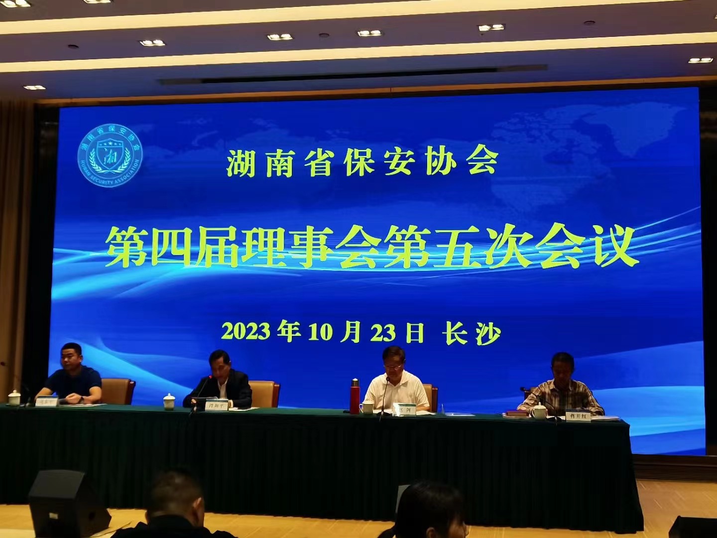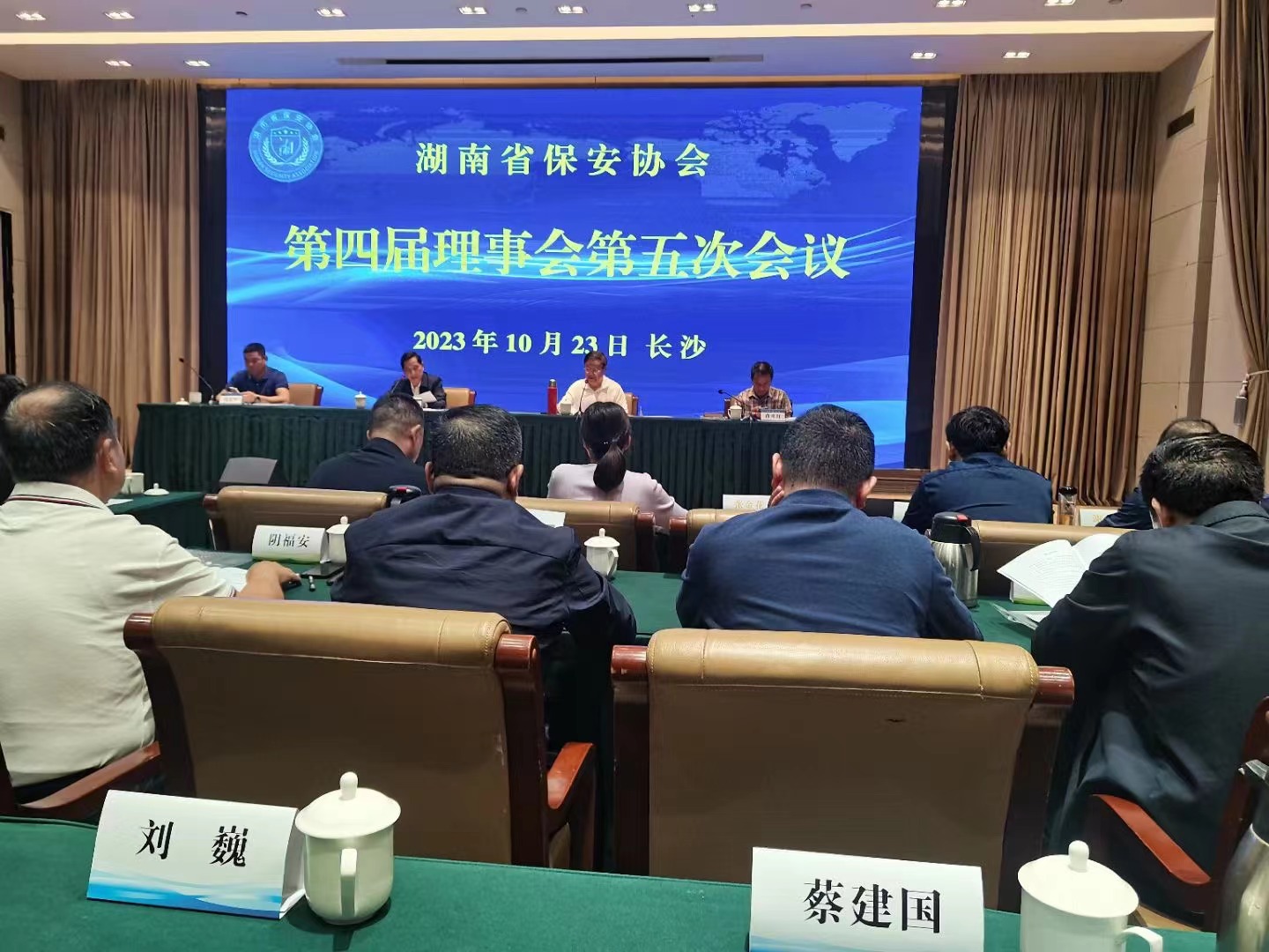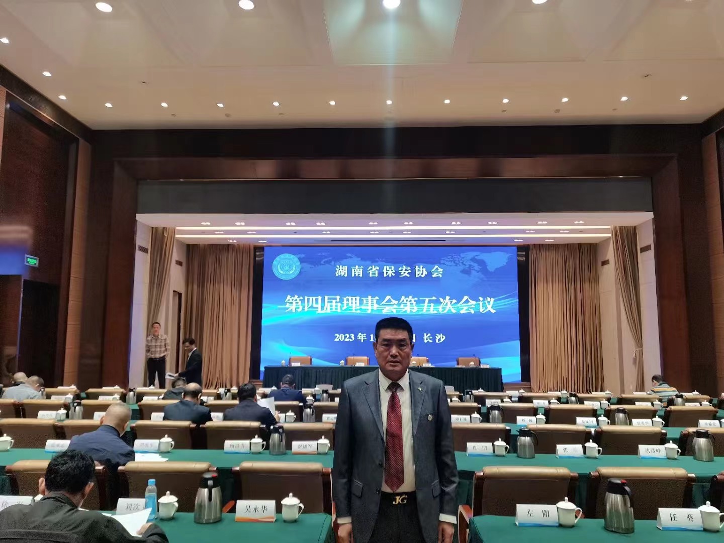 湖南省保安协会第四届理事会第五次会议于2023年10月23日在长沙蓉园宾馆召开!会议选举湖南省公安厅内保支队长胡东军为秘书长,湖南省公安厅党委委员、副厅长谭学军出席并作重要讲话!省保安协会会长谭和平,顾问赵剑,治安总队副总队长庞俊,协会执行秘书长蒋开红和全省保安协会理事参加!省保安协会副会长、建囯保安公司董事长蔡建国参加会议!