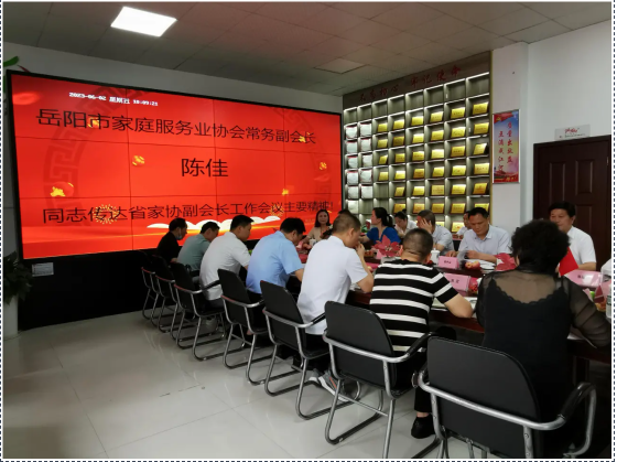 2023 年 6 月 2 日上午 10 点,岳阳市家庭服务业协会理事会在岳阳市佳佳好家庭服务管理有限公司顺利召开。岳阳市民政局党组成员副局长谭应兵、岳阳市商务粮食局服贸科科长袁中山、岳阳市商务粮食局服贸科副科长郑丽及共计 20 家会员单位理事莅临佳佳好总部参与本次会议。本次理事会由市家协秘书长罗良才主持,岳阳日报全程跟踪报道。