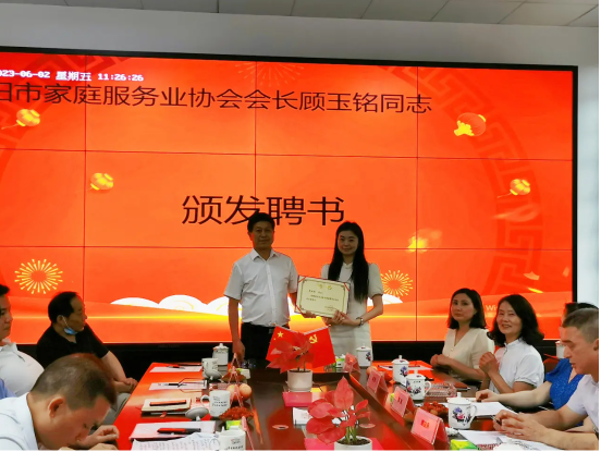 会议第五项,岳阳市家庭服务业协会会长顾玉铭同志聘任岳阳市佳佳好家庭服务管理有限公司财务部长谭诗婷同志为岳阳市家庭服务业协会办公室主任,并现场颁发聘书。