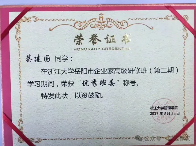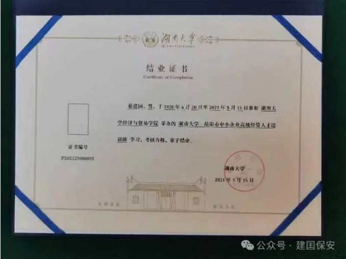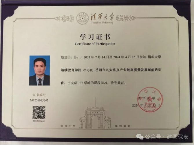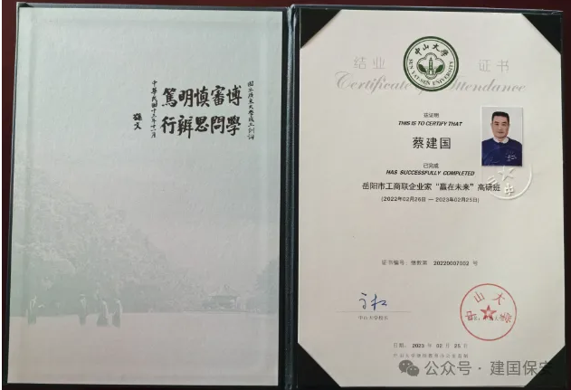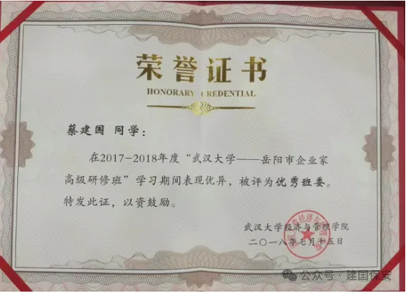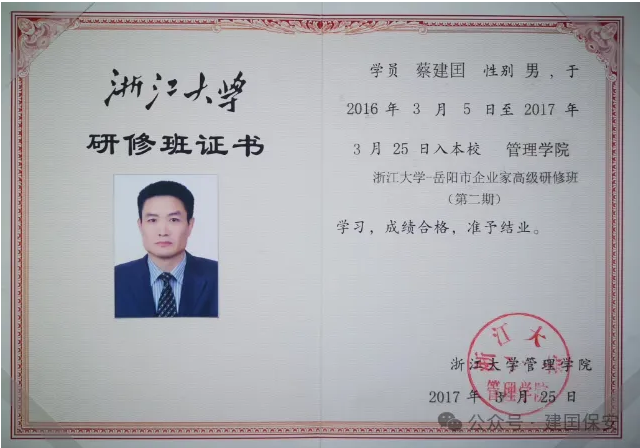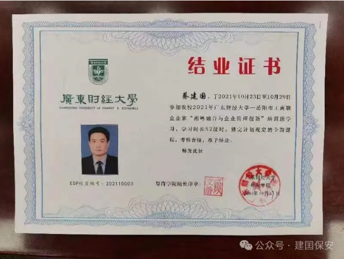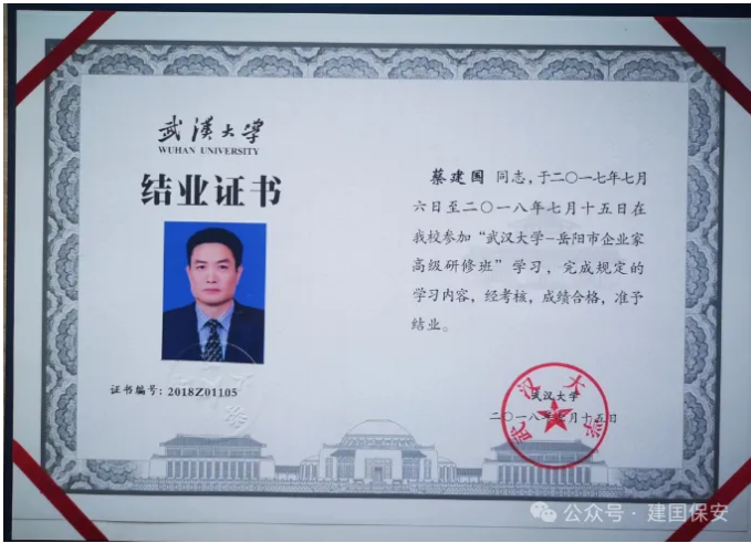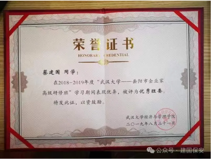 董事长蔡建国为学习借鉴其他单位经验,到目前为止已自费七届参加各大名校企业家高级研修班,(浙江大学第二期,武汉大学一期,武汉大学第二期,湖南大学,广东财经大学,中山大学,清华大学)为推动企业发展提供不竭动力!公司自创立以来,在省、市领导的正确指引和全体员工的不懈努力下迅速发展,规模壮大,现已成为服务城市发展、维护人民生命财产安全中不可或缺的中坚力量!
