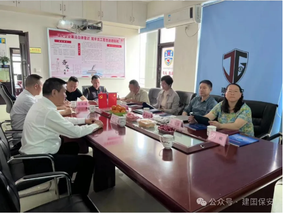 座谈会上,首先观看了公司企业文化宣传片,了解公司目前发展态势、未来发展远景和保安日常培训、工作生活写照,而后几方就校园安全形势、安保队伍建设、专业技能培训、应急预案演练等方面进行了深入的探讨和交流。湖南理工学院姜处长首先对公司以党建引领企业发展、企业为社会所做贡献、公司对高校安保工作的付出给予了高度的赞扬,湖南民族职业学院夏处长对校园安保工作提出要在精神面貌、业务培训和队伍建设上求精求细的要求,岳阳职业技术学院陈处长湖南建囯保安公司近几年来在校园安全保卫方面所取得的成绩给予了高度评价,并表示将进一步加强与保安公司的合作,共同为校园安全保驾护航。